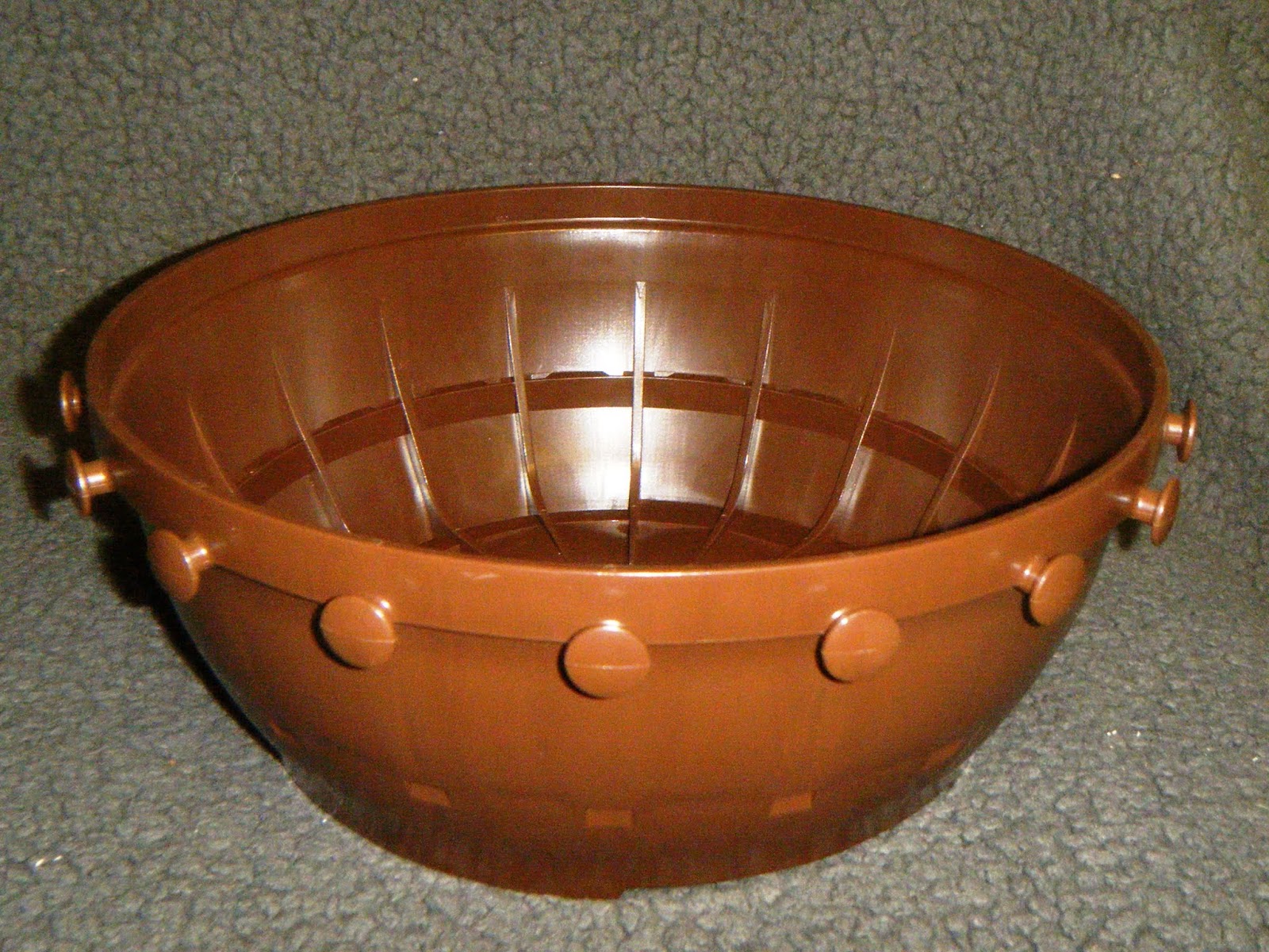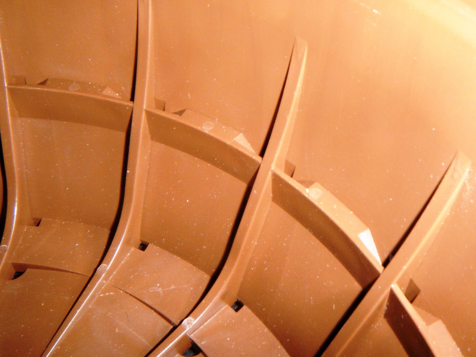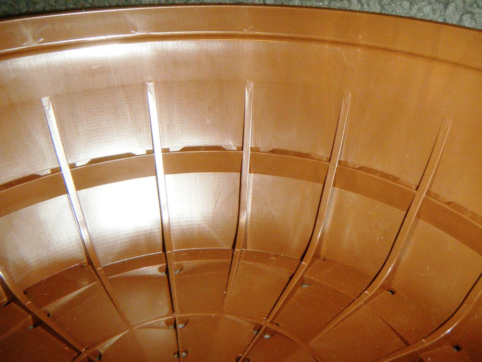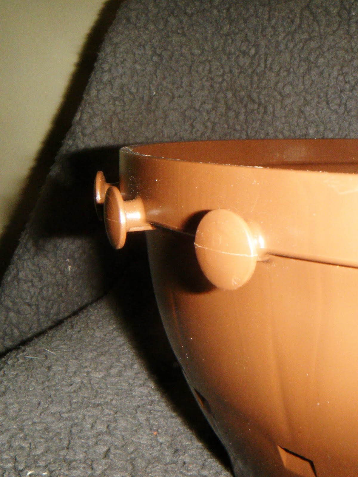 Notice the narrow shelf running around the inside of the pot, about two inches above the pot floor. Notice that wherever that shelf is intersected by a ridge, there’s a little ramp on either side, leading down like a funnel. Those “funnels” guide the rootlets to openings to the outside, as the next picture shows.