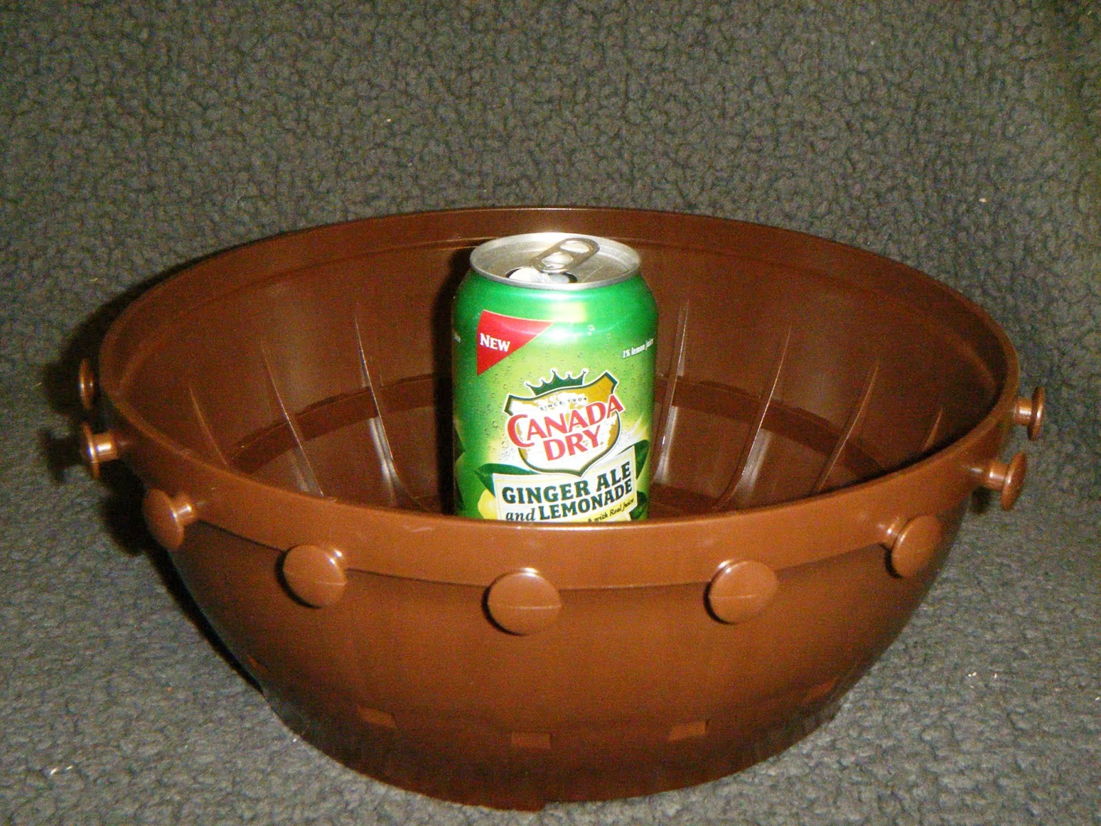 I haven’t yet had my hands on both the pot and my tape measure at the same time, but I can say the pot’s diameter is very close to 8 inches at the bottom and 12 inches at the rim. Internal depth is about 4 inches. I estimate it will hold between one and one-and-one-half US gallons (roughly 3½ to 5 liters). Here’s a picture with a standard 12-ounce beverage can right in the center.