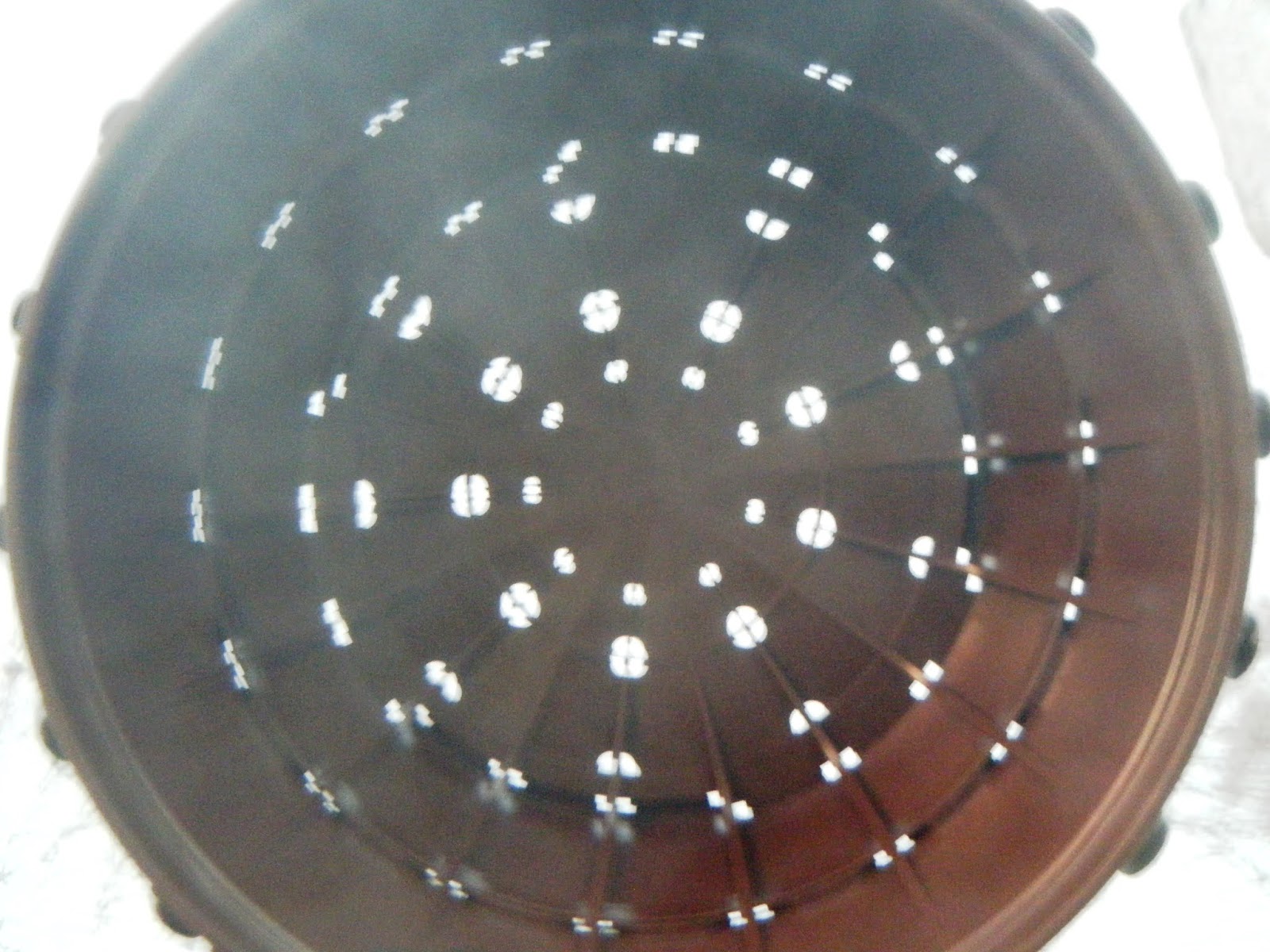 Forgive the blurriness of the next picture, but I don’t have a better one. I held the pot up to the early-evening sky to show just how many holes the bottom of the pot contains. All those holes give root tips access to the outside air. The eight largest holes that form an inner ring should also serve adequately for drainage. They are each only about a half-inch across, but there are eight of them.
