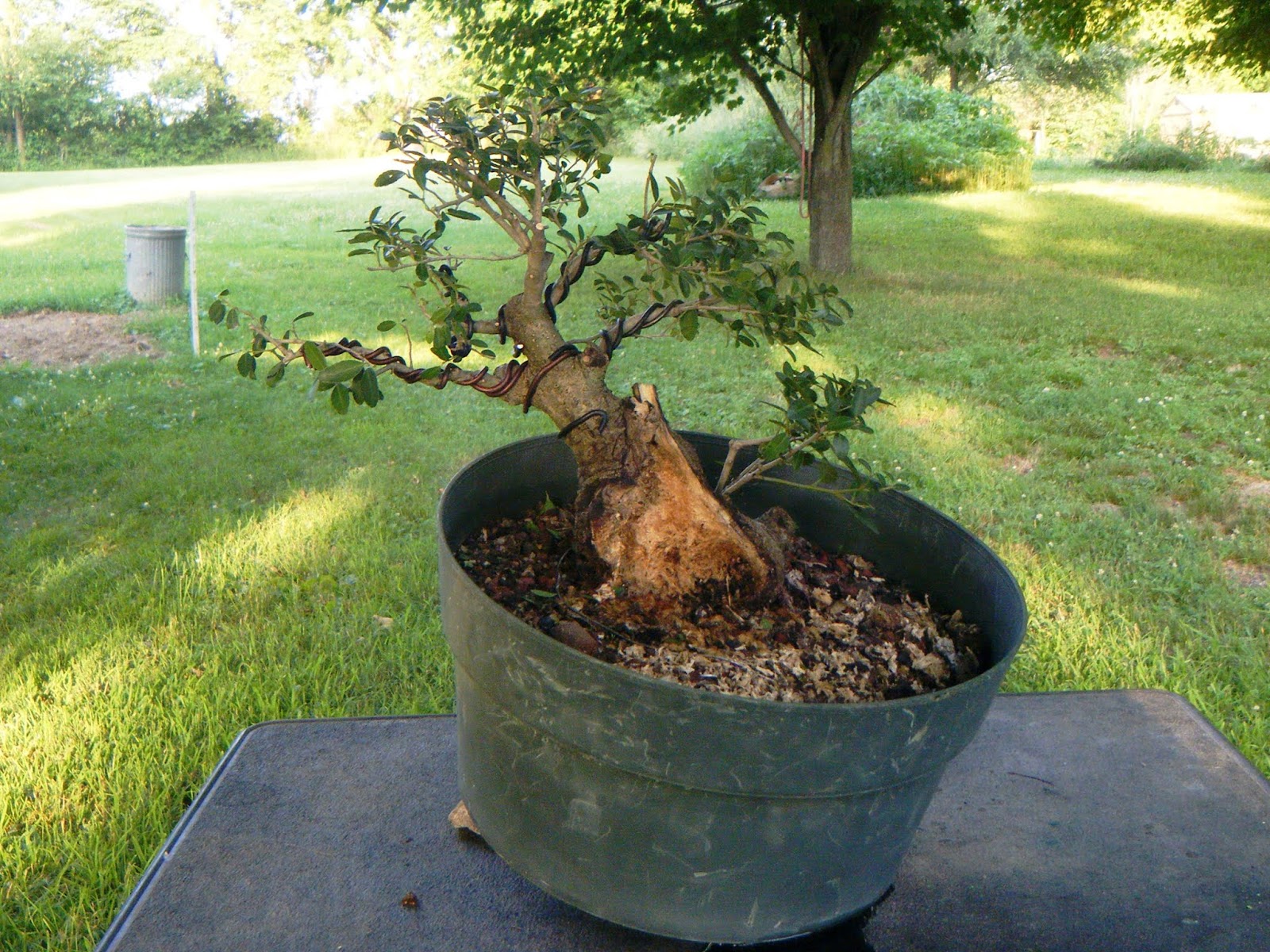 Obviously I have yet to grow anything in my new pot, but I expect it to live up to the claims about it. And I believe I have an appropriate candidate for its first occupant: this dwarf yaupon holly (Ilex vomitoria ‘Schilling’) that I got last summer in a workshop with Adam Lavigne of “Adam’s Art and Bonsai.” If any of tree of mine will need guy wires to keep it stable after repotting, this will be one. Look at that hollowed and twisted lower trunk!