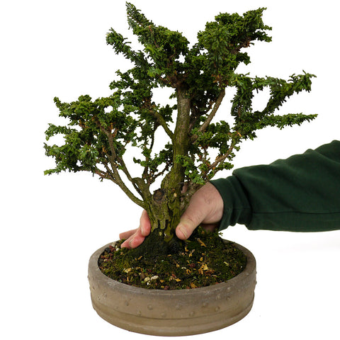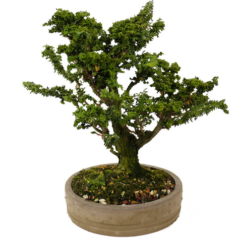 The common name for this attractive plant is Sekka Hinoki cypress and the botanical name is Chamaecyparis obtusa var Sekka. The Sekka variety is most appreciated for its fine tight emerald green foliage. Like most Hinoki and other Chamaecyparis (False cypress) it can tolerate winter temperature, but does require some protection where winters are very cold. A secure cold frame or out building is best, with some heat when temps are below 15F. Like all of our bonsai, the tree in the photo is the one you'll receive.